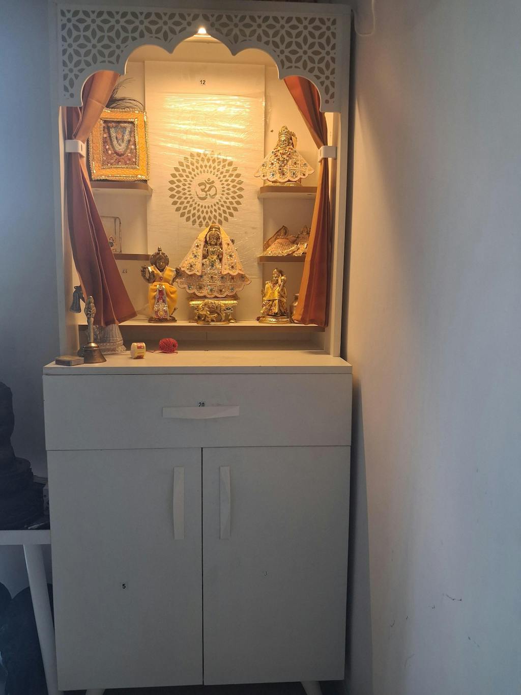 Color: White with Golden Motif, Type: Floor Standing Pooja Mandir, Including: Spacious Prayer Area with Decorative Jaali, Pull-Out Drawer & Cabinet Storage to Organize Spiritual Essentials & Offerings